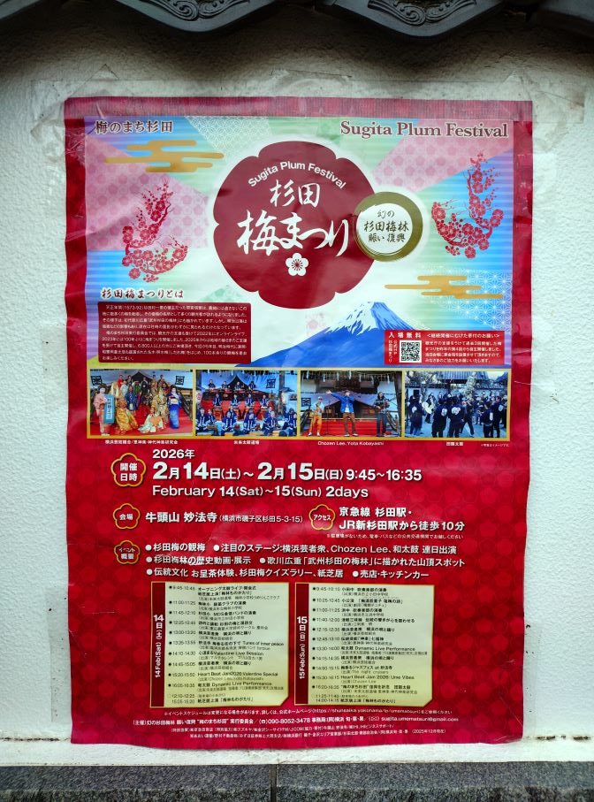 2026年2月14日に、井土ヶ谷駅から京浜急行で4駅先にある杉田駅から徒歩10分くらいにある牛頭山妙法寺で開催された「杉田梅まつり」に行ってみました。