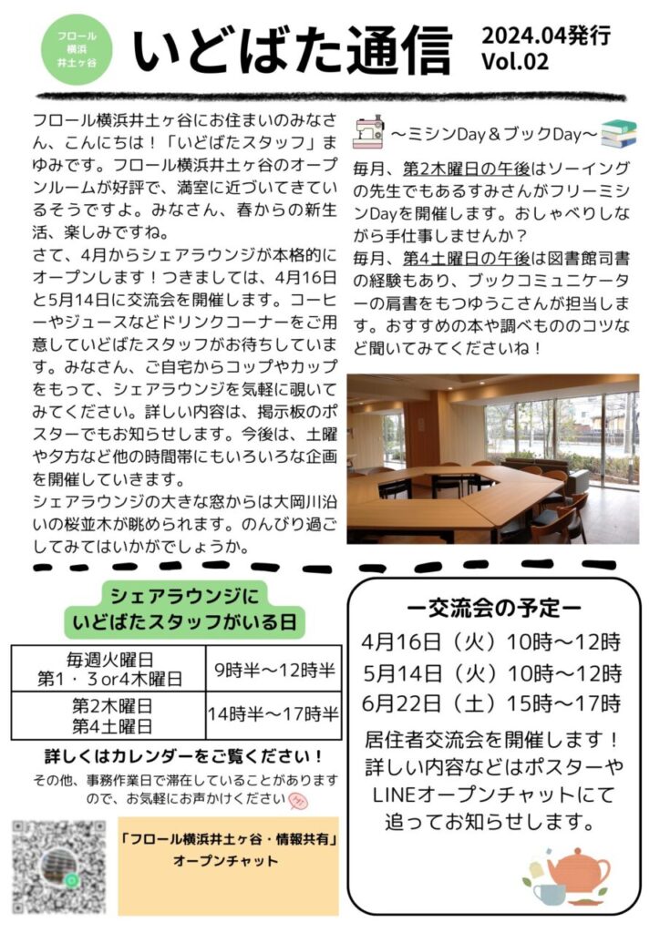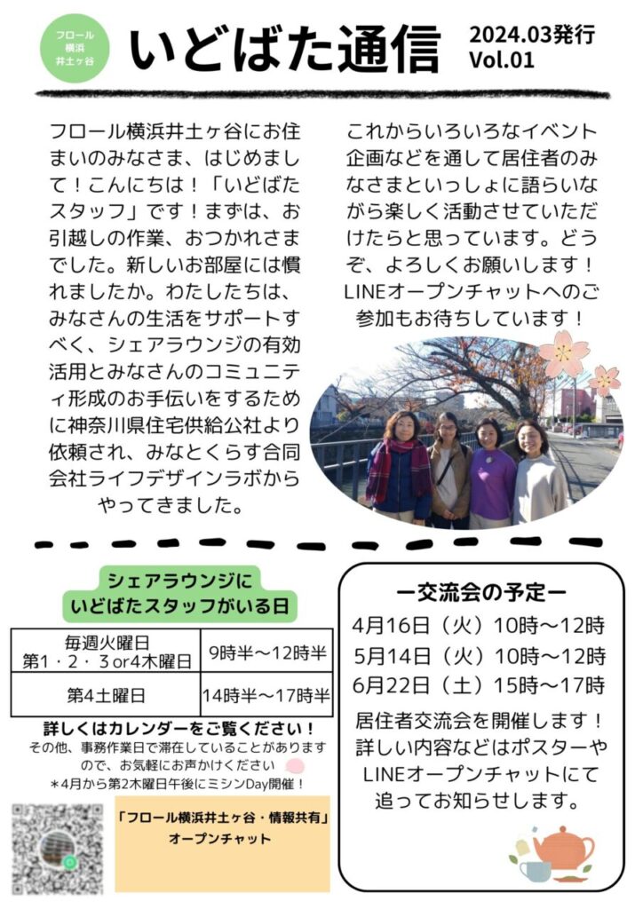 フロール横浜井土ヶ谷のシェアラウンジでコミュニティ作りのお手伝いをしているいどばたスタッフは、月に一回、居住者のみなさん宛に『いどばた通信』を発行しています。