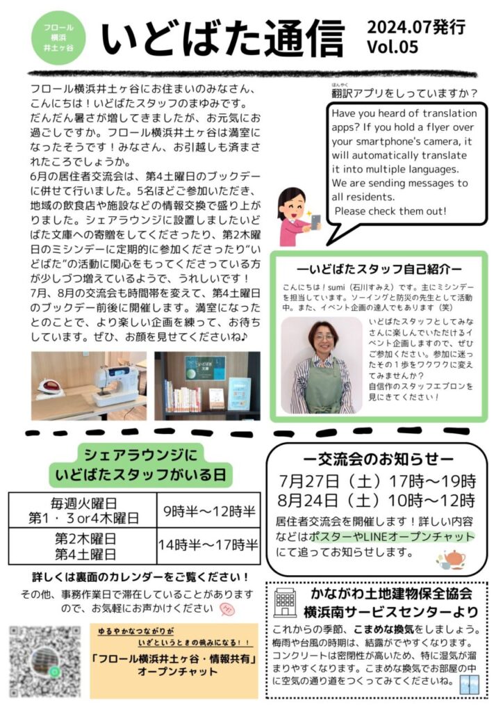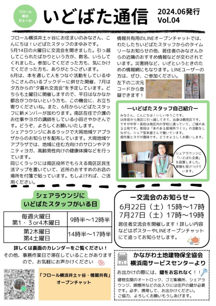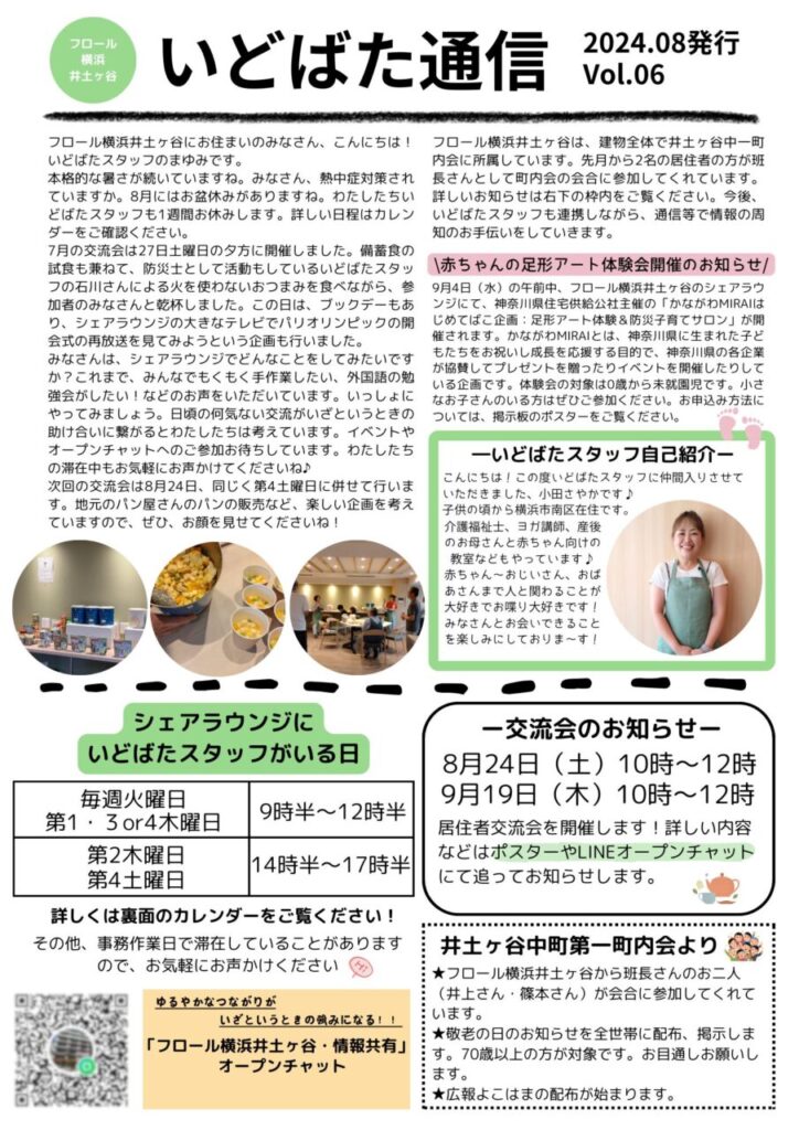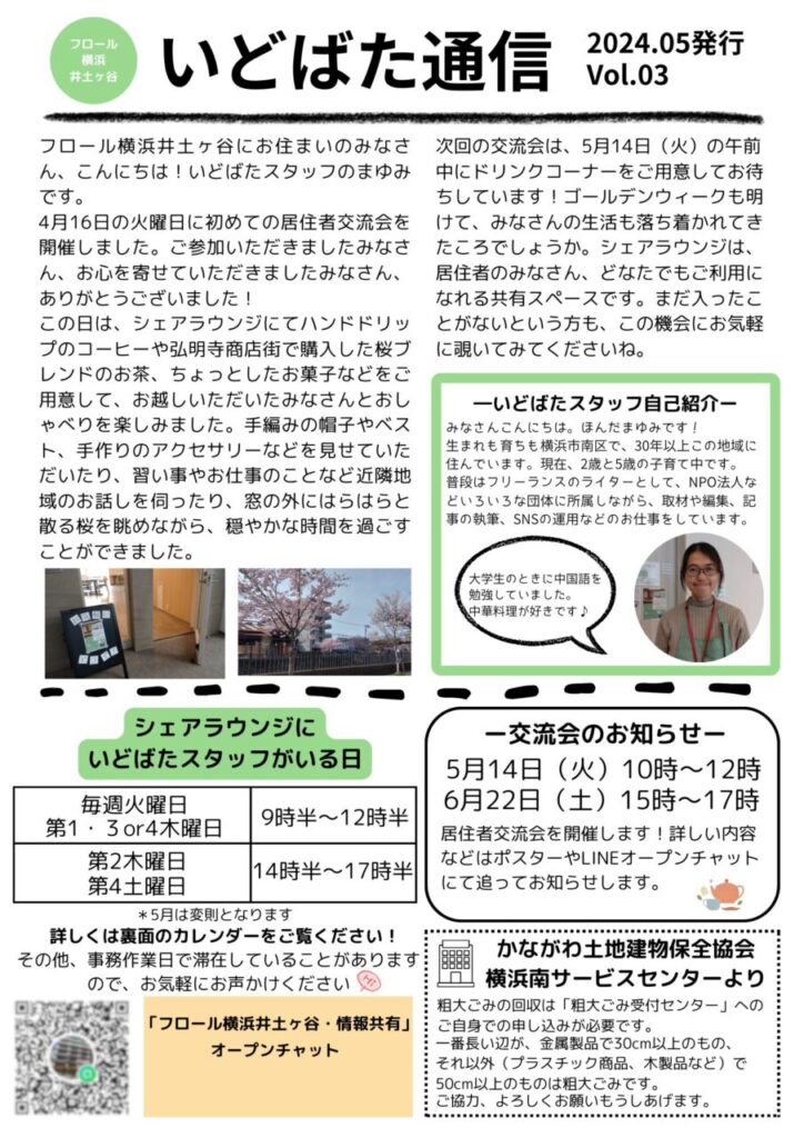 フロール横浜井土ヶ谷のシェアラウンジでコミュニティ作りのお手伝いをしているいどばたスタッフは、月に一回、居住者のみなさん宛に『いどばた通信』を発行しています。